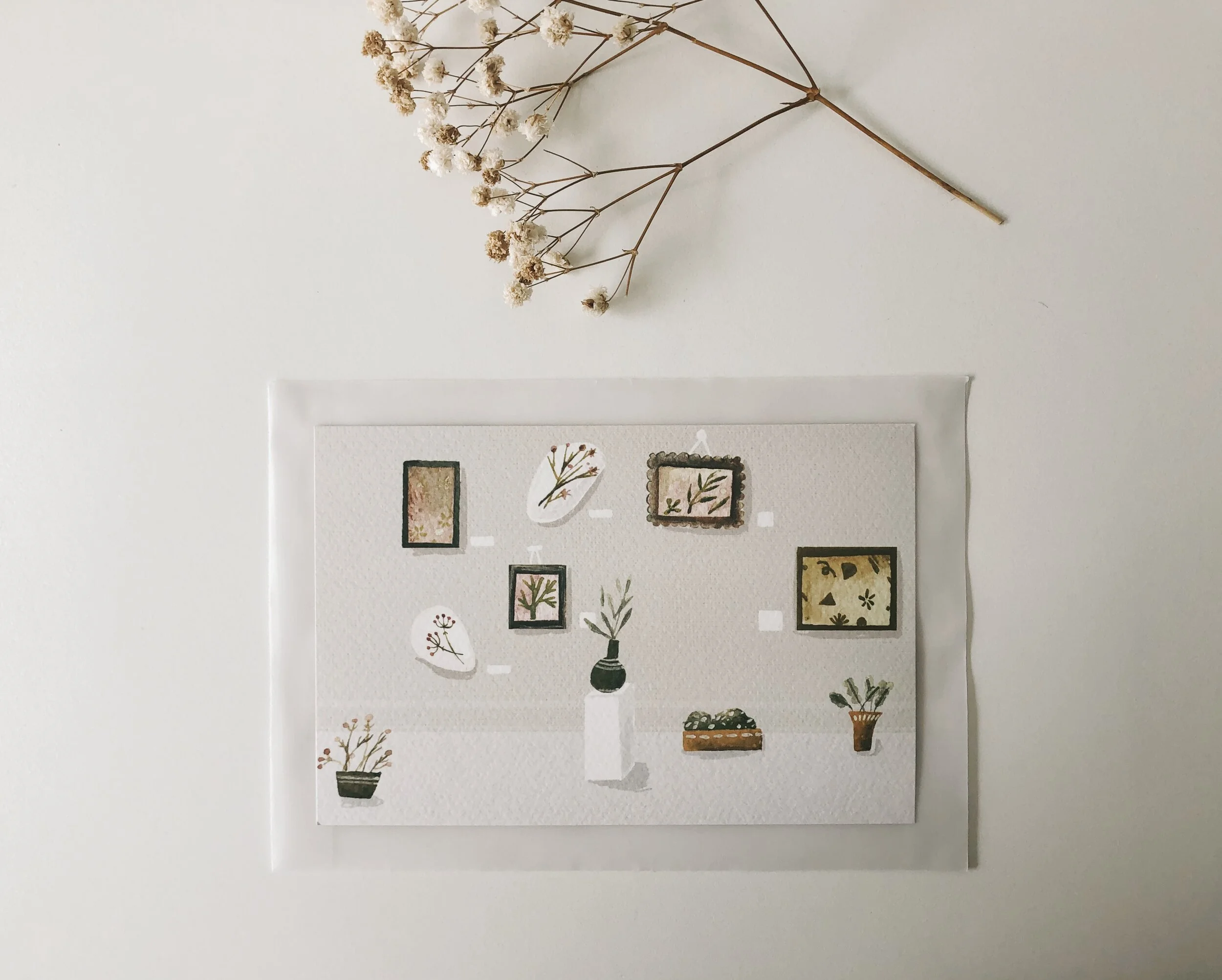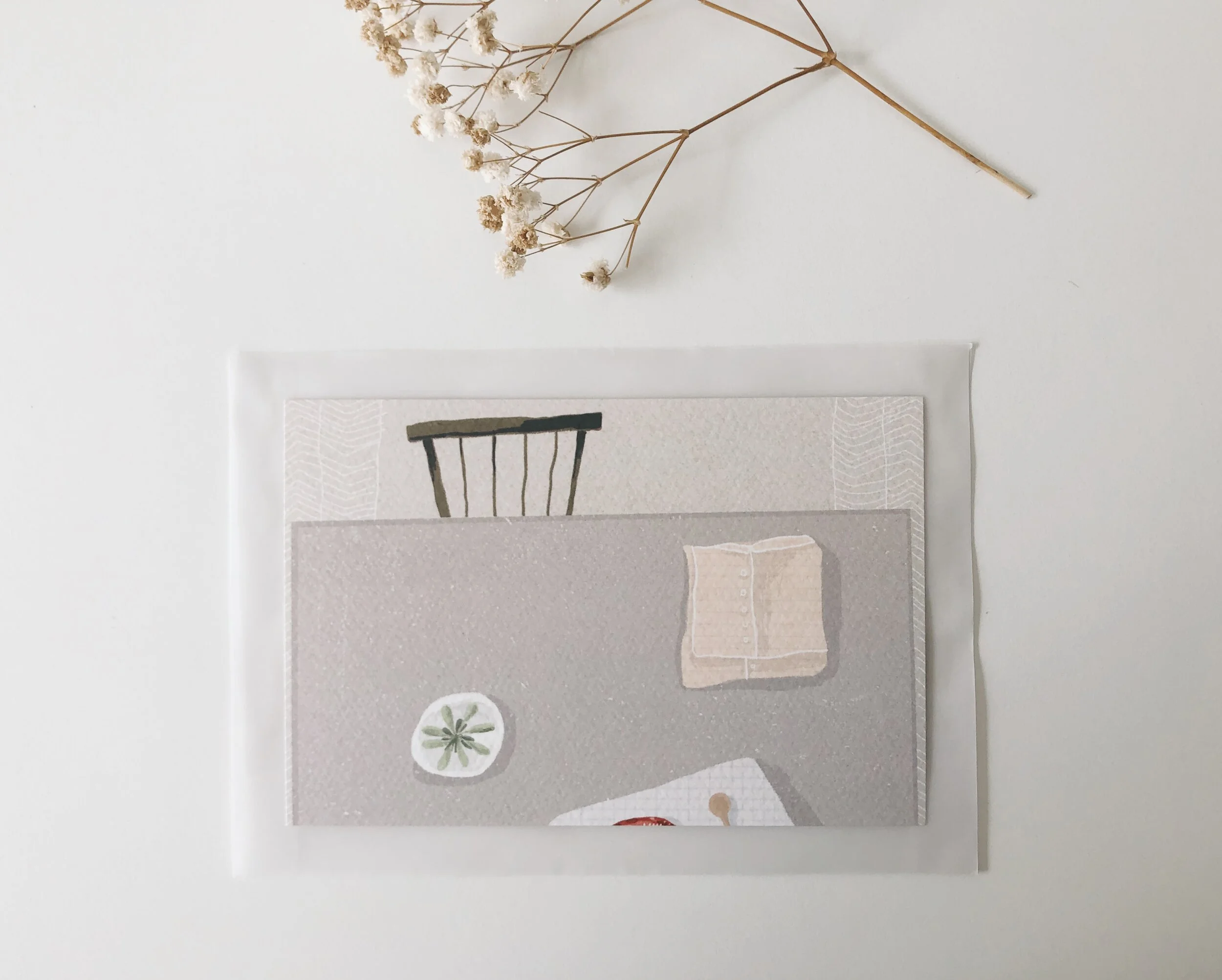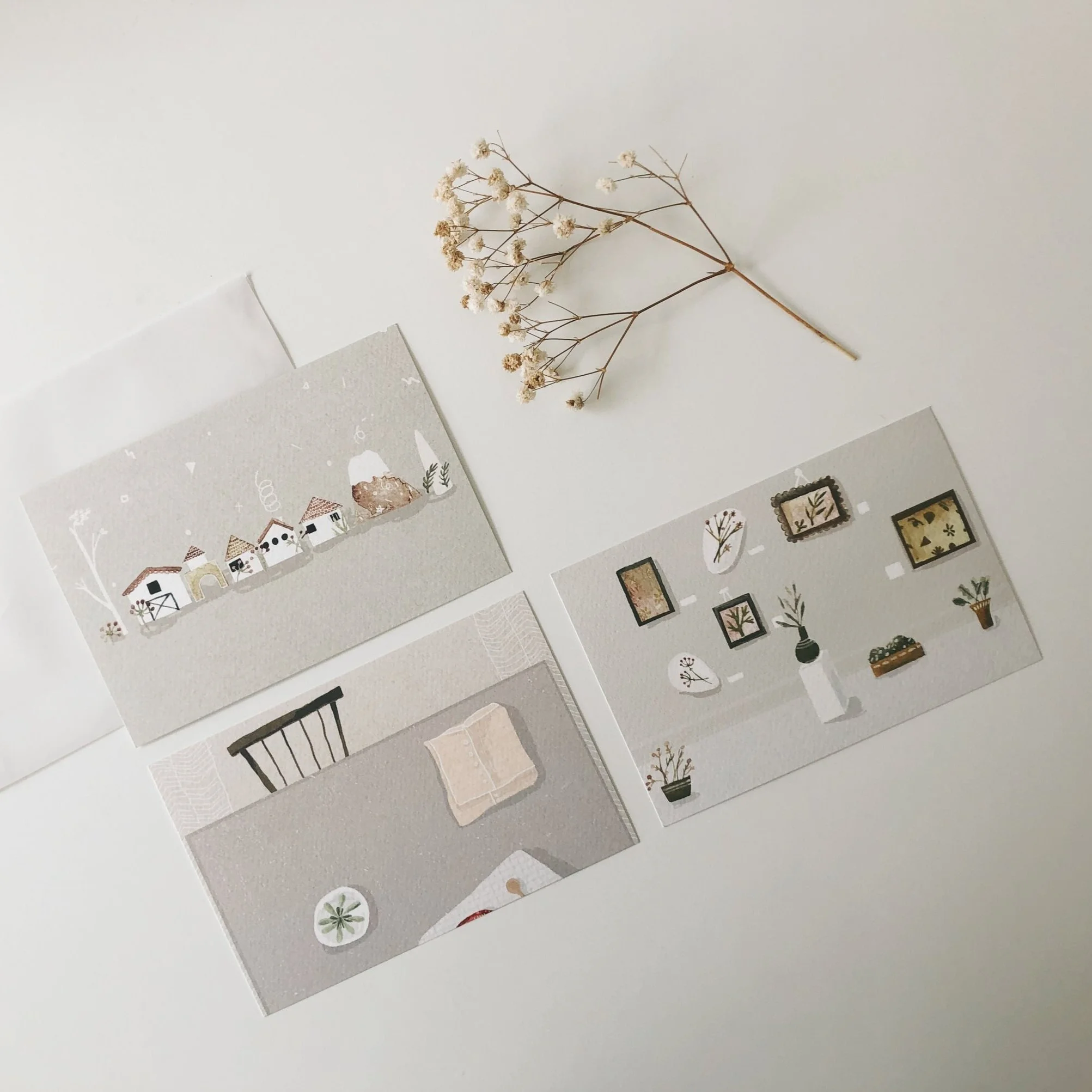 A6 single-sided print of original illustration. Set of 3 postcards printed on textured heavy cardstock. Ships with envelopes.