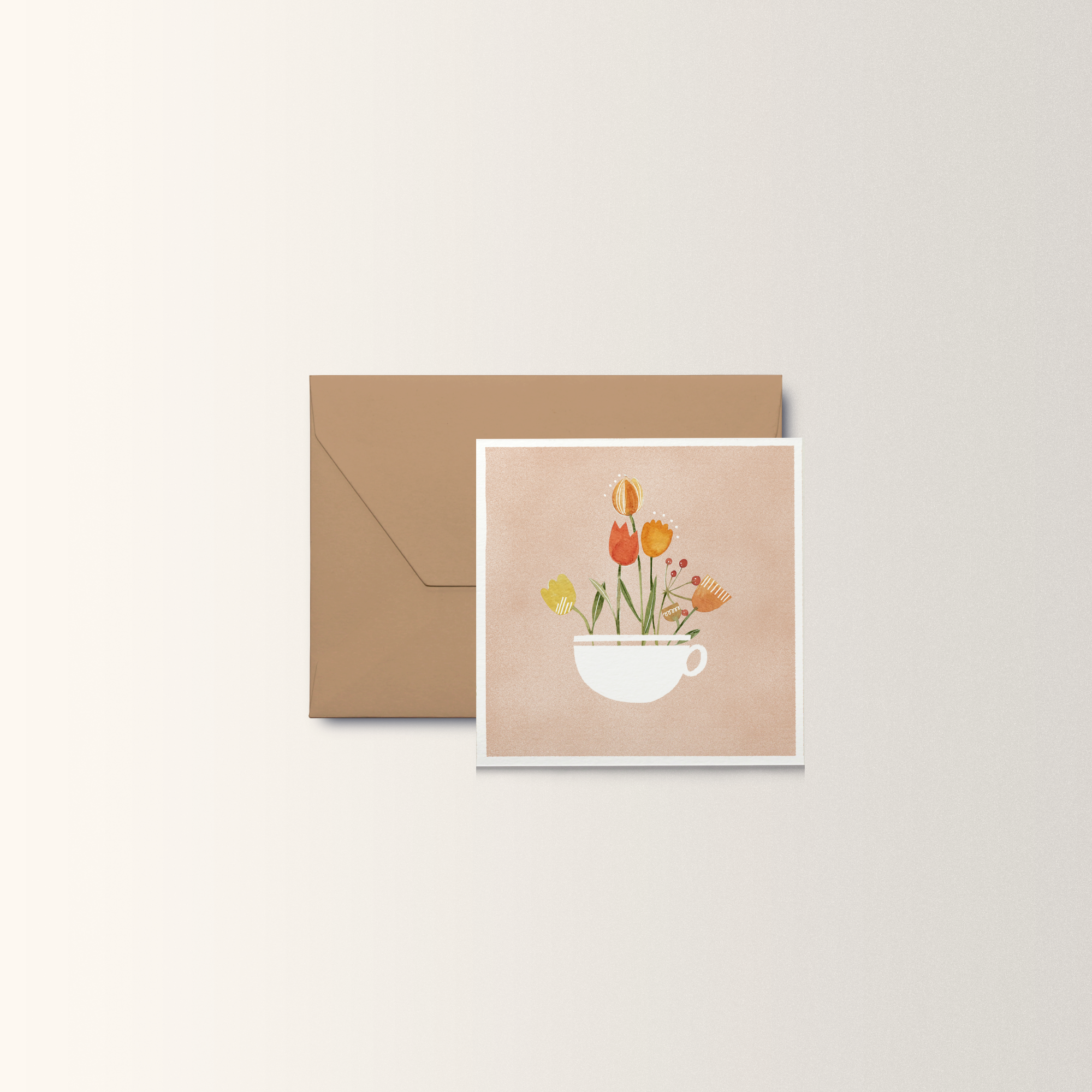 A teacup of tulips. 10cm x 10cm folded greeting card. Textured heavy cardstock. Ships with square kraft envelope.